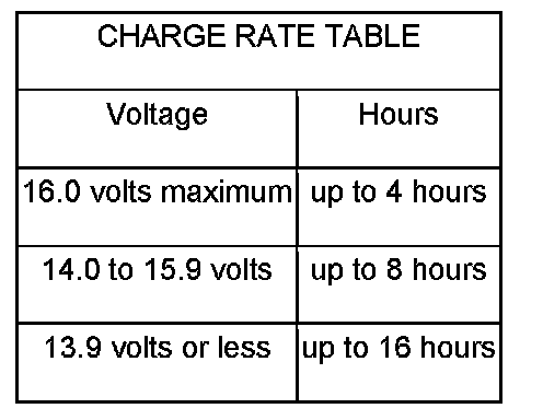 3. Battery chargers vary in the amount of voltage and current they provide. The amount of time required for a battery to accept measurable charging current at various voltages is shown in the Charge Rate Table. If the charging current is still not measurable at the end of the charging time, the battery is inoperative and must be replaced. If the charging current is measurable during the charging time, the battery may be good and the charging should be completed in the normal manner.