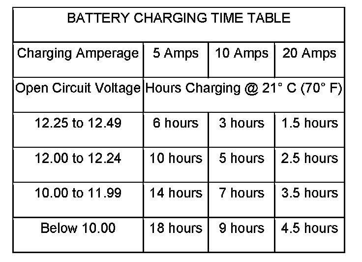 The Battery Charging Time Table gives an indication of the time required to charge a typical battery at room temperature based upon the battery state-of-charge and the charger capacity.