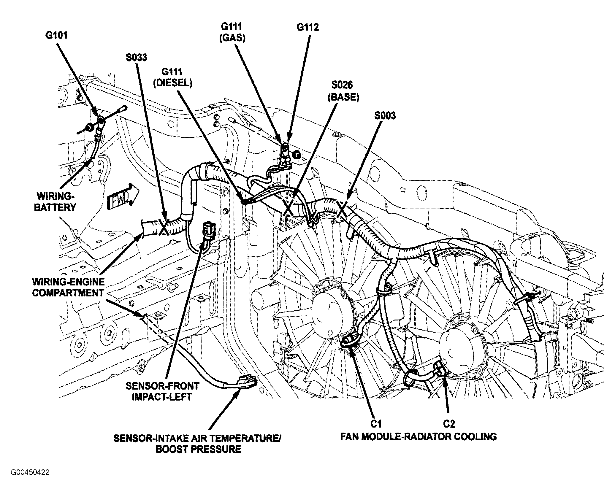 | Radiator Cooling Fan Module | Front center engine compartment. See Figure. |