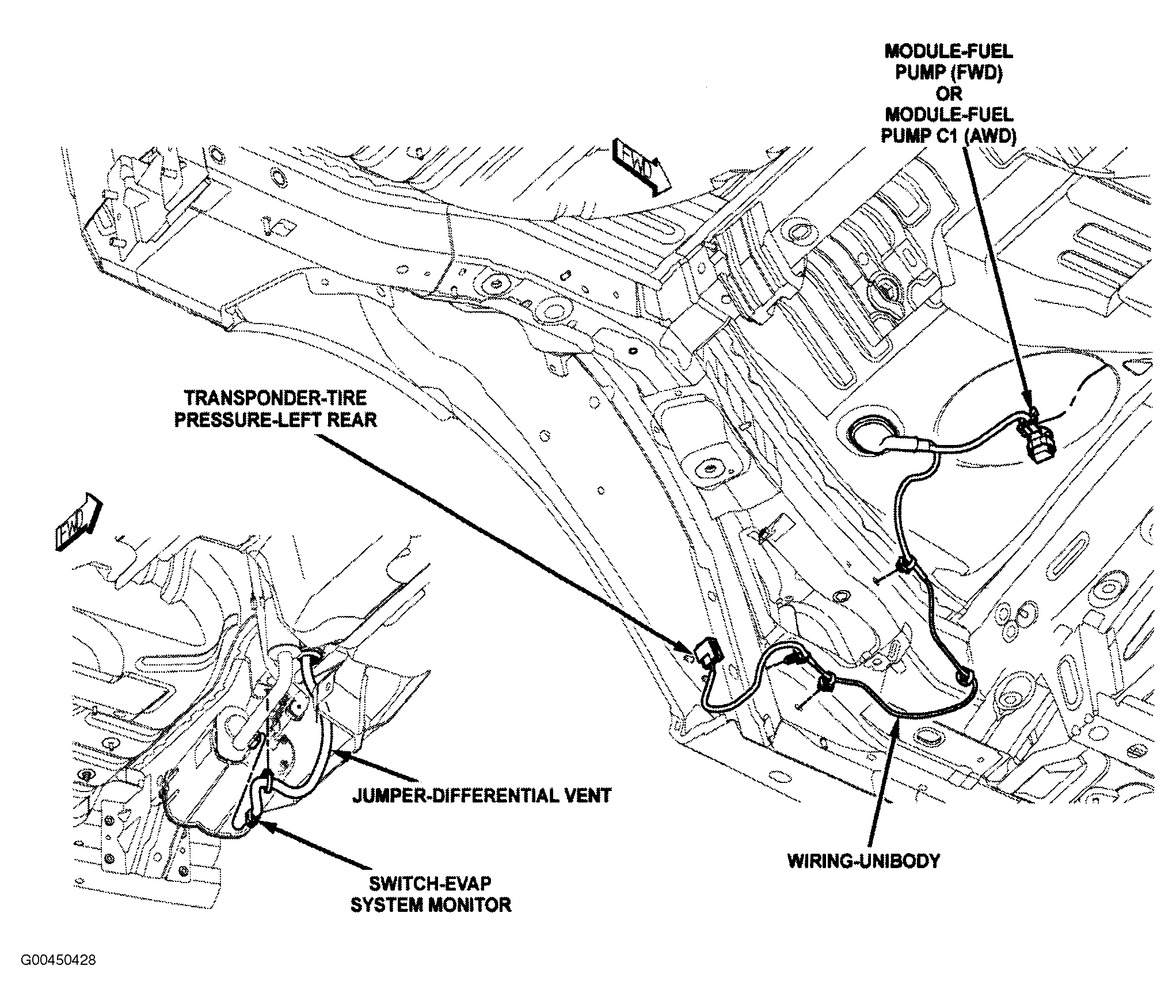 | Fuel Pump Module (FWD) | On fuel tank. See Figure. |