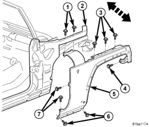 8. After correct fender gap and flush specifications are obtained, tighten all the upper fender fasteners (1, 3, 4 and 7) to 5 Nm (45 in. lbs.).