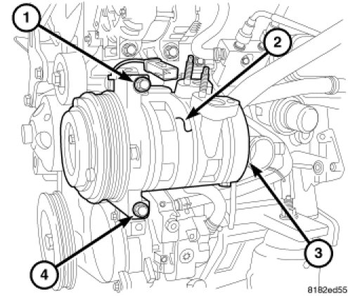 3. Loosely install the three bolts (1, 3 and 4) that secure the A/C compressor to the engine. Tighten each of the fasteners to 28 Nm (21 ft. lbs.) using the following sequence: