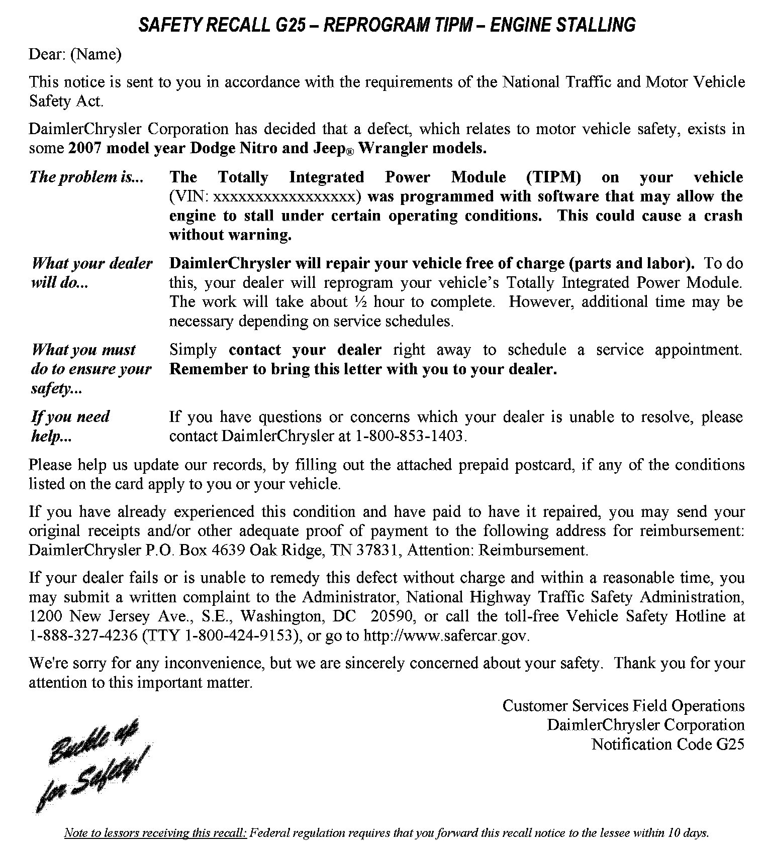 Recall - TIPM Reprogramming for Engine Stalling