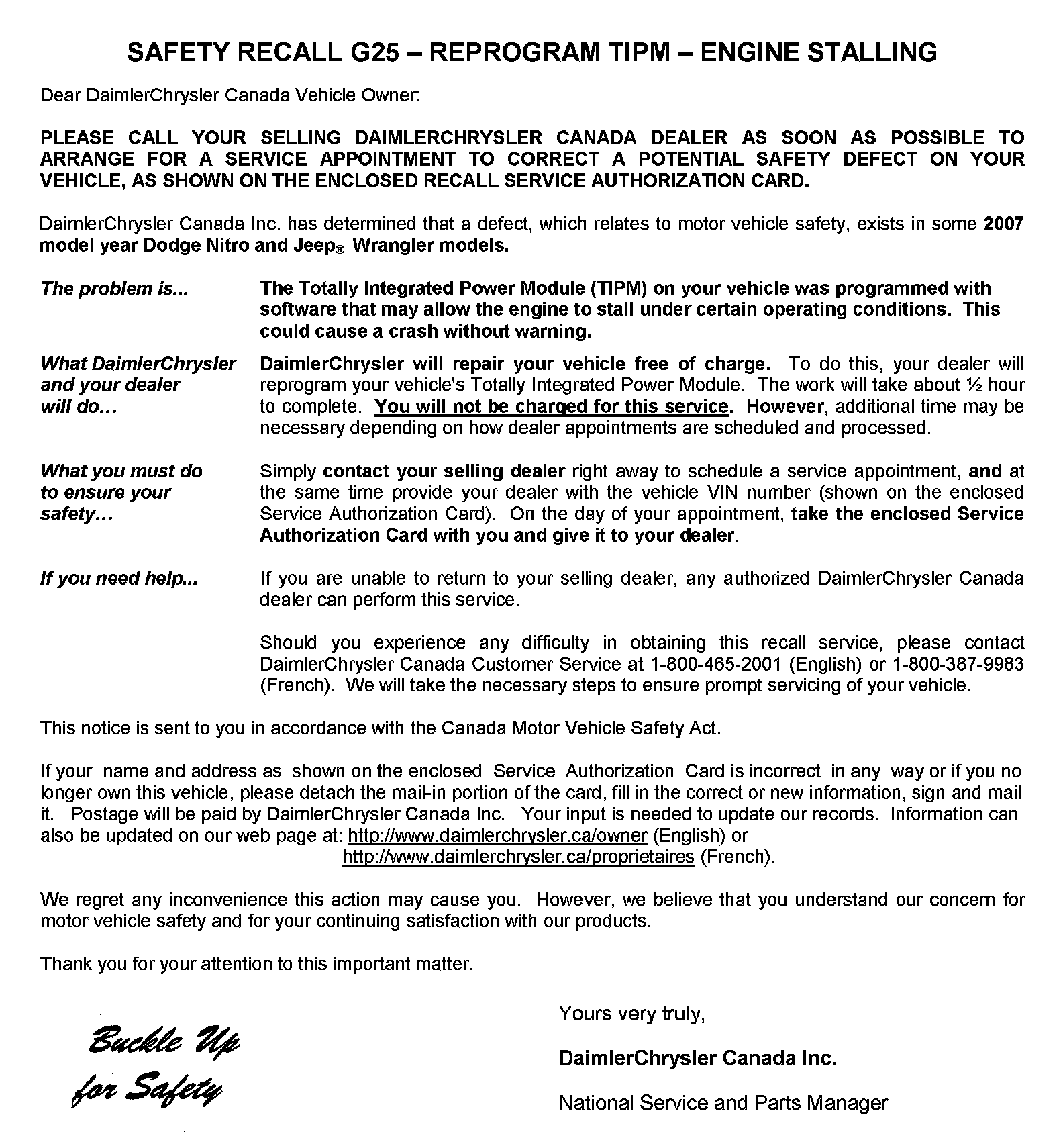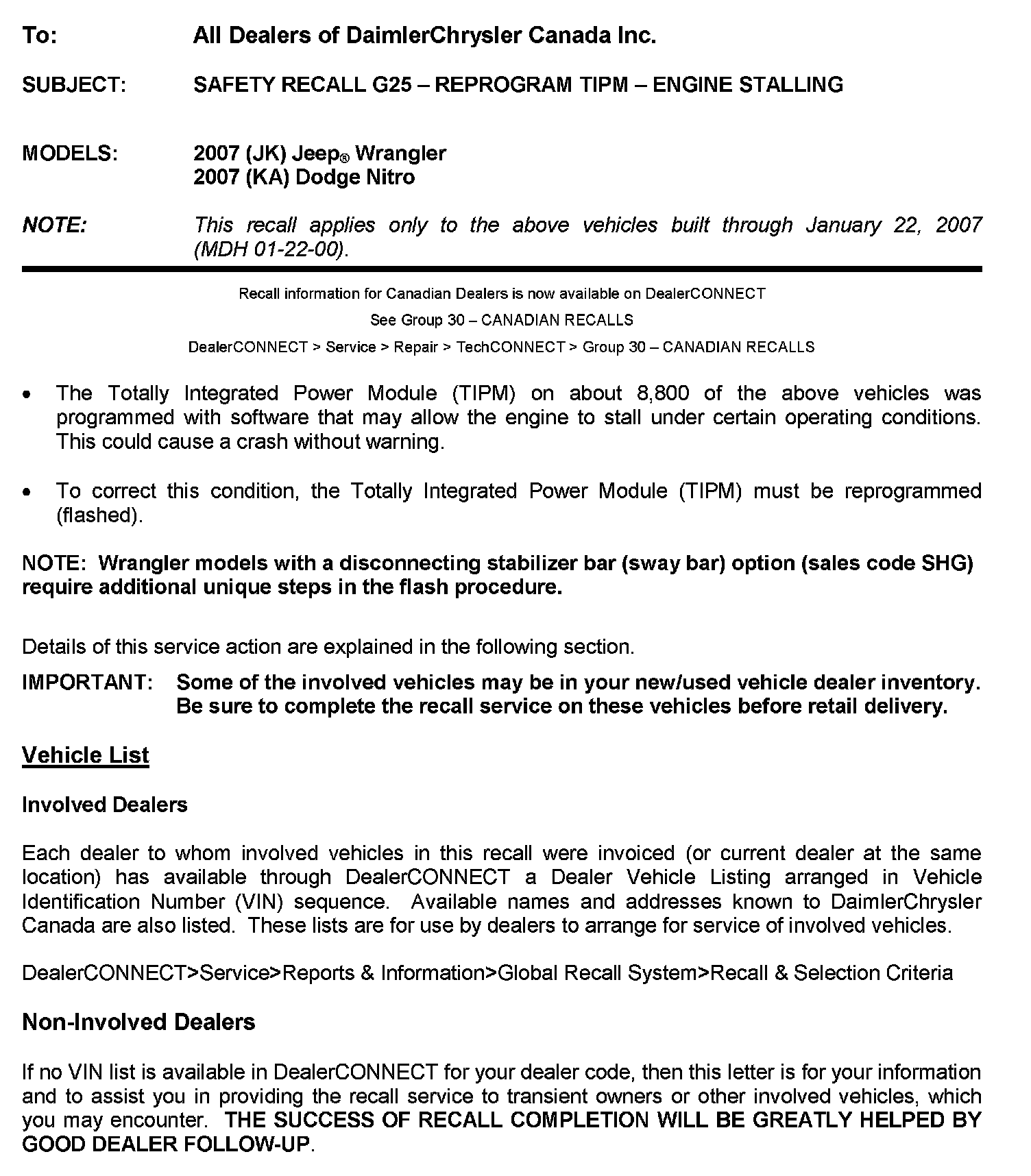 Home >> Jeep >> 2007 >> Wrangler V6-3.8L >> Repair and Diagnosis >> Powertrain Management >> Computers and Control Systems >> Relays and Modules - Computers and Control Systems >> Engine Control Module >> Technical Service Bulletins >> Recalls >> Canada- Recall - G25 Reprogram TIPM-Engine Stalling