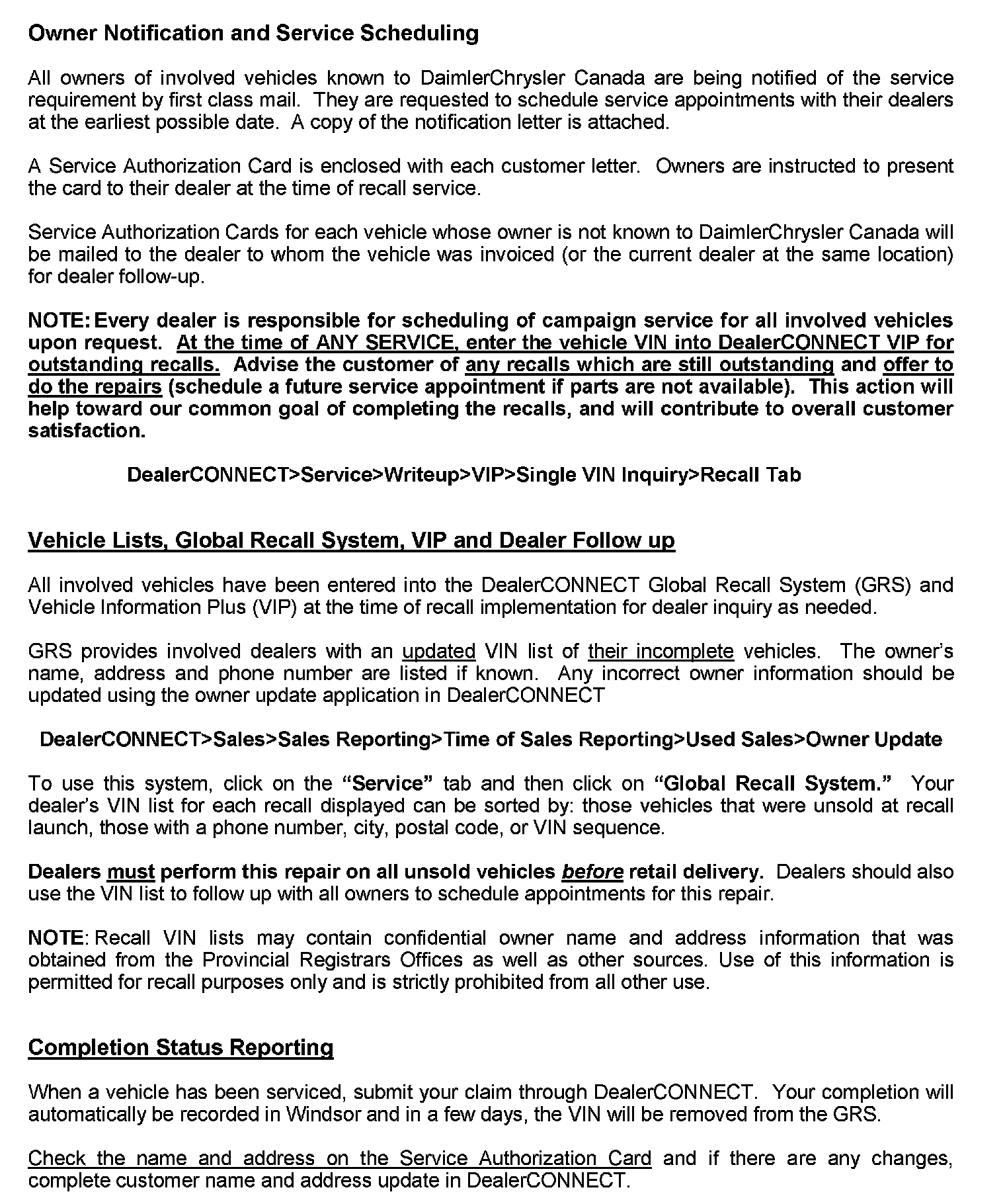 GRS has been developed to provide dealers with an up-to-date list of involved vehicles by recall number and by dealer code. Owners known to DaimlerChrysler are also listed. Involved vehicles will be removed from the GRS within several days of submitting repair claims.