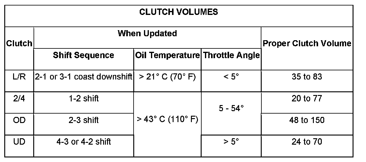 Certain mechanical problems within the input clutch assembly (broken return springs, out of position snap rings, excessive clutch pack clearance, improper assembly, etc.) can cause inadequate or out-of-range element volumes. Also, defective Input/Output Speed Sensors and wiring can cause these conditions. The following chart identifies the appropriate clutch volumes and when they are monitored/updated: