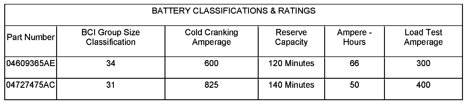 NOTE: Vehicles equipped with a diesel engine utilize a unique battery. The specifications for this battery may differ from the standards shown here. Refer to the battery manufacturer for detailed specifications.