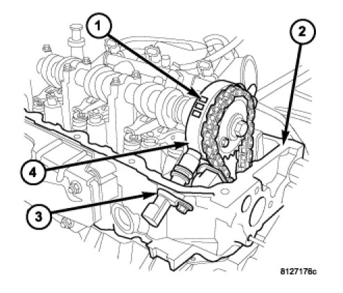 The Camshaft Position Sensor (CMP) sensor on the 3.7L (3) contains a hall effect device referred to as a sync signal generator. A rotating target wheel (tonewheel) (4) for the CMP is located at the front of the camshaft for the right cylinder head (2). This sync signal generator detects notches (1) located on a tonewheel. As the tonewheel rotates, the notches pass through the sync signal generator. The signal from the CMP sensor is used in conjunction with the Crankshaft Position Sensor (CKP) to differentiate between fuel injection and spark events. It is also used to synchronize the fuel injectors with their respective cylinders.