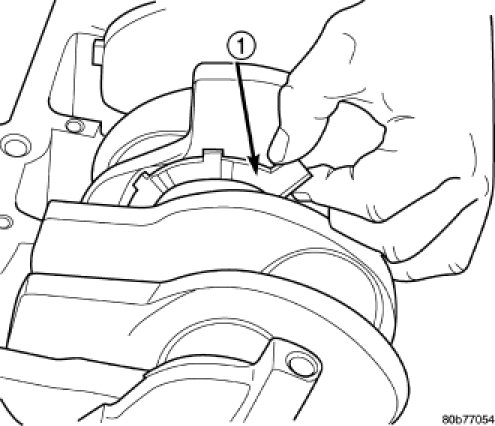 4. Apply a 2.5mm (0.100 inch) bead of Mopar(R) Engine RTV sealant to the cylinder block-to-bedplate mating surface (1) and (2).