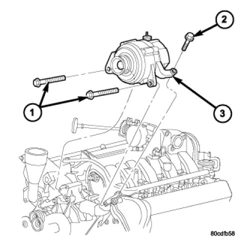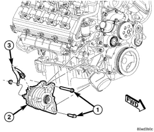 1. Position generator (3) to engine and install 2 horizontal bolts (1) and 1 vertical bolt (2).