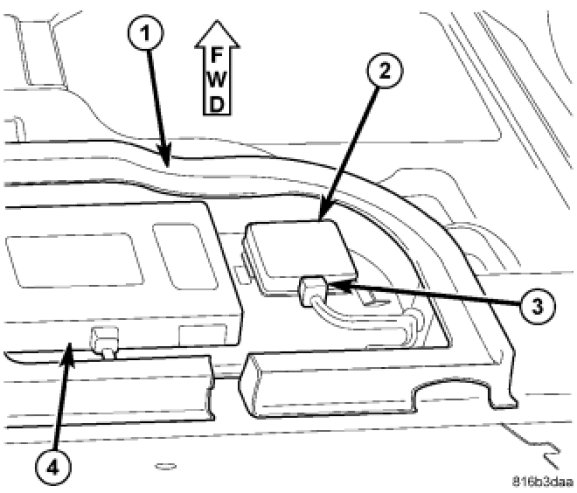 4. Disconnect the body wire harness connector (3) from the intrusion module (2) connector receptacle.