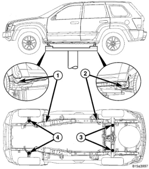 WARNING: The hoisting and jack lifting points provided are for a complete vehicle. When a chassis or drivetrain component is removed from a vehicle, the center of gravity is altered making some hoisting conditions unstable. Properly support or secure vehicle to hoisting device when these conditions exist.