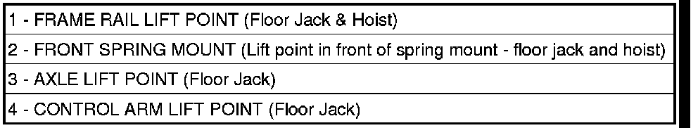 When properly positioned, a floor jack can be used to lift the vehicle (3 and 4). Support the vehicle in the raised position with jack stands at the front and rear ends of the frame rails (1 and 2).