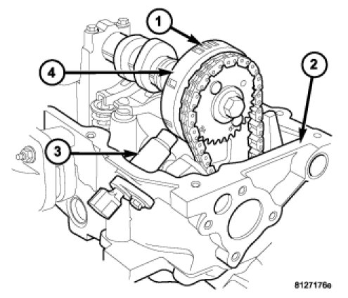 The Camshaft Position Sensor (CMP) (3) is bolted to the right-front side of the right cylinder head (2).
