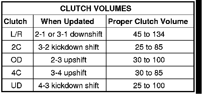 Certain mechanical failures within the input clutch assembly can cause inadequate or out-of-range element volumes. Also, defective Input/Output Speed Sensors and wiring can cause these conditions. The following chart identifies the appropriate clutch volumes and when they are monitored/updated: