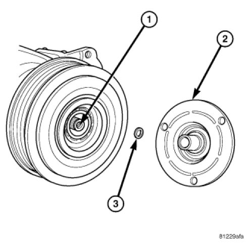 1. If the original clutch plate (2) and pulley and bearing assembly are to be reused, reinstall the original shim(s) (3) onto the compressor shaft (1). If a new clutch plate and pulley and bearing assembly are being used, install a trial stack of shims 2.54 mm (0.010 in.) thick onto the compressor shaft.