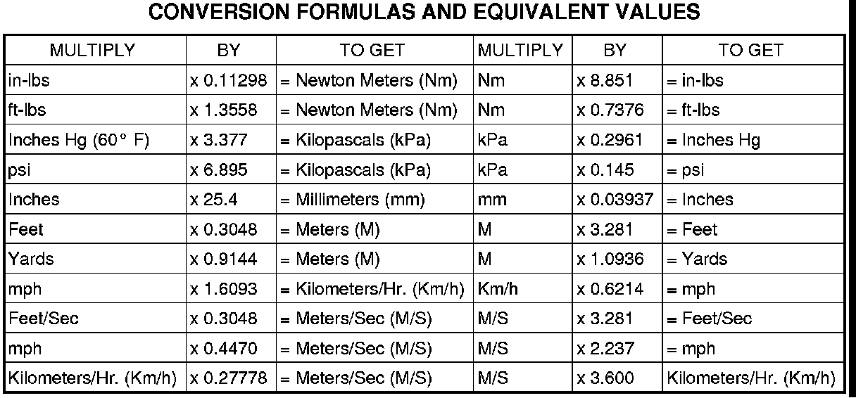Refer to the Metric Conversion Chart to convert torque values listed in metric Newton-meters (Nm). Also, use the chart to convert between millimeters (mm) and inches (in.).