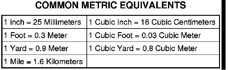The following chart will assist in converting metric units to equivalent English and SAE units, or vise versa.