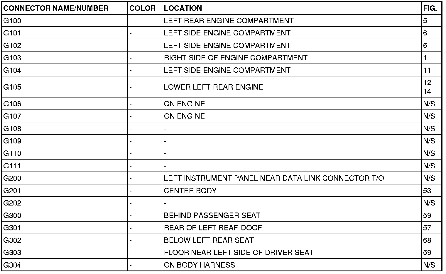 This section provides illustrations identifying connector, ground and splice locations in the vehicle. Connector, ground and splice indexes are provided. Use the wiring diagrams in each section for connector, ground and splice identification. Refer to the appropriate index for the proper figure number. For items that are not shown in this section N/S is placed in the Fig. column.
