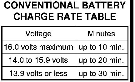 3. Battery chargers vary in the amount of voltage and current they provide. The amount of time required for a battery to accept measurable charging current at various voltages is shown in the Charge Rate Table. If the charging current is still not measurable at the end of the charging time, the battery is faulty and must be replaced. If the charging current is measurable during the charging time, the battery may be good and the charging should be completed in the normal manner.