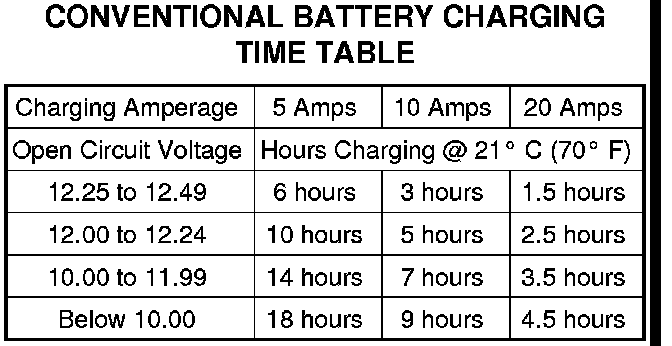 The Conventional Battery Charging Time Table gives an indication of the time required to charge a typical battery at room temperature based upon the battery state-of-charge and the charger capacity.