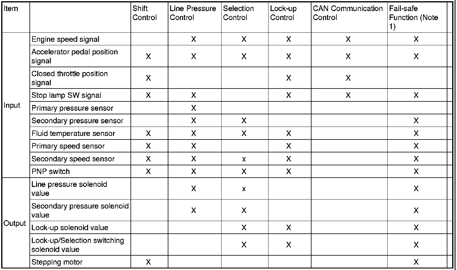 TCM sends information such as fast slowdown signals, lock-up signals, torque down request signals to ECM, while receiving information such as torque down permission/prohibition signals, lock-up permission/prohibition signals, throttle position from ECM.