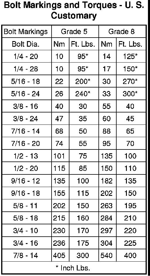The SAE bolt strength grades range from grade 2 to grade 8. The higher the grade number, the greater the bolt strength. Identification is determined by the line marks on the top of each bolt head. The actual bolt strength grade corresponds to the number of line marks plus 2. The most commonly used metric bolt strength classes are 8.9 and 10.9. The metric strength class identification number is imprinted on the head of the bolt. The higher the class number, the greater the bolt strength. Some metric nuts are imprinted with a single-digit strength class on the nut face. Refer to the Fastener Identification and Fastener Strength Charts.