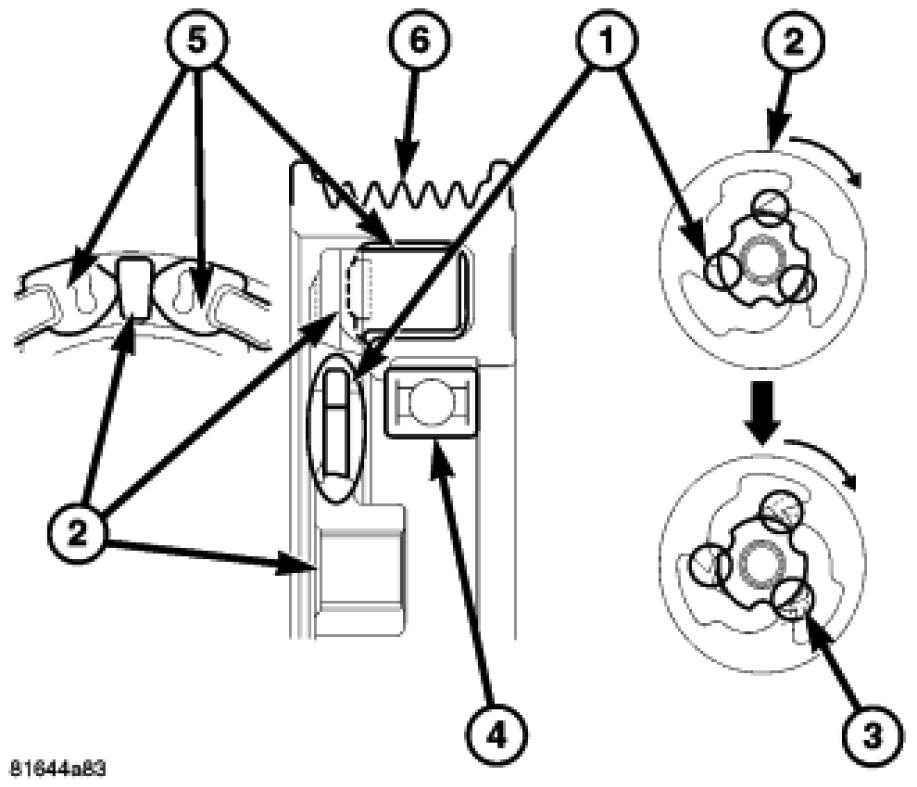 Check the non-servicable pulley bearing (4) for roughness or excessive noise. Check the pulley dampeners (5) for excessive play which can be caused by deterioration or damage. Inspect the belt surfaces of the non-servicable pulley (4) for wear. If the pulley surfaces are oily, inspect the shaft and nose area of the A/C compressor for refrigerant oil. If refrigerant oil is found, the compressor shaft seal is leaking and the A/C compressor must be replaced.
