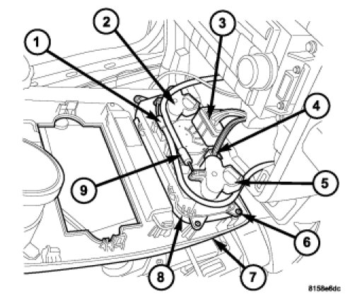 4. Connect the control cables (1 and 9) to the mode door control sector gear (2) and the temperature control sector gear (5) and fully engage the retaining clips. Make sure the retaining clips are fully engaged to the sector gears.