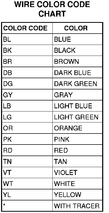 Each wire shown in the diagrams contains a code which identifies the main circuit, a specific part of the main circuit, gage of wire, and color. An example would be A 2 18 LB/YL. This is a Battery Feed circuit, level two, eighteen gauge, light blue with a yellow tracer.