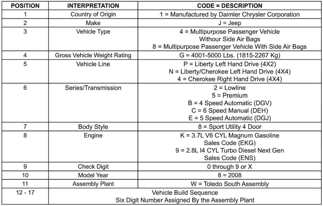 Home >> Jeep >> 2008 >> Liberty 2WD V6-3.7L >> Repair and Diagnosis >> Application and ID >> Vehicle Identification Number Decoding Chart