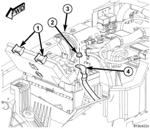 4. Position the TIPM positive cable (4) onto the mounting stud and install the retaining nut (2). Tighten the nut to 9 - 11 Nm (80 - 100 in. lbs.).