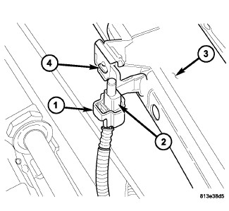 1. Install the ambient air temperature sensor (2) onto the top of the front bumper beam (3). Make sure that the retaining tabs (4) are fully engaged.