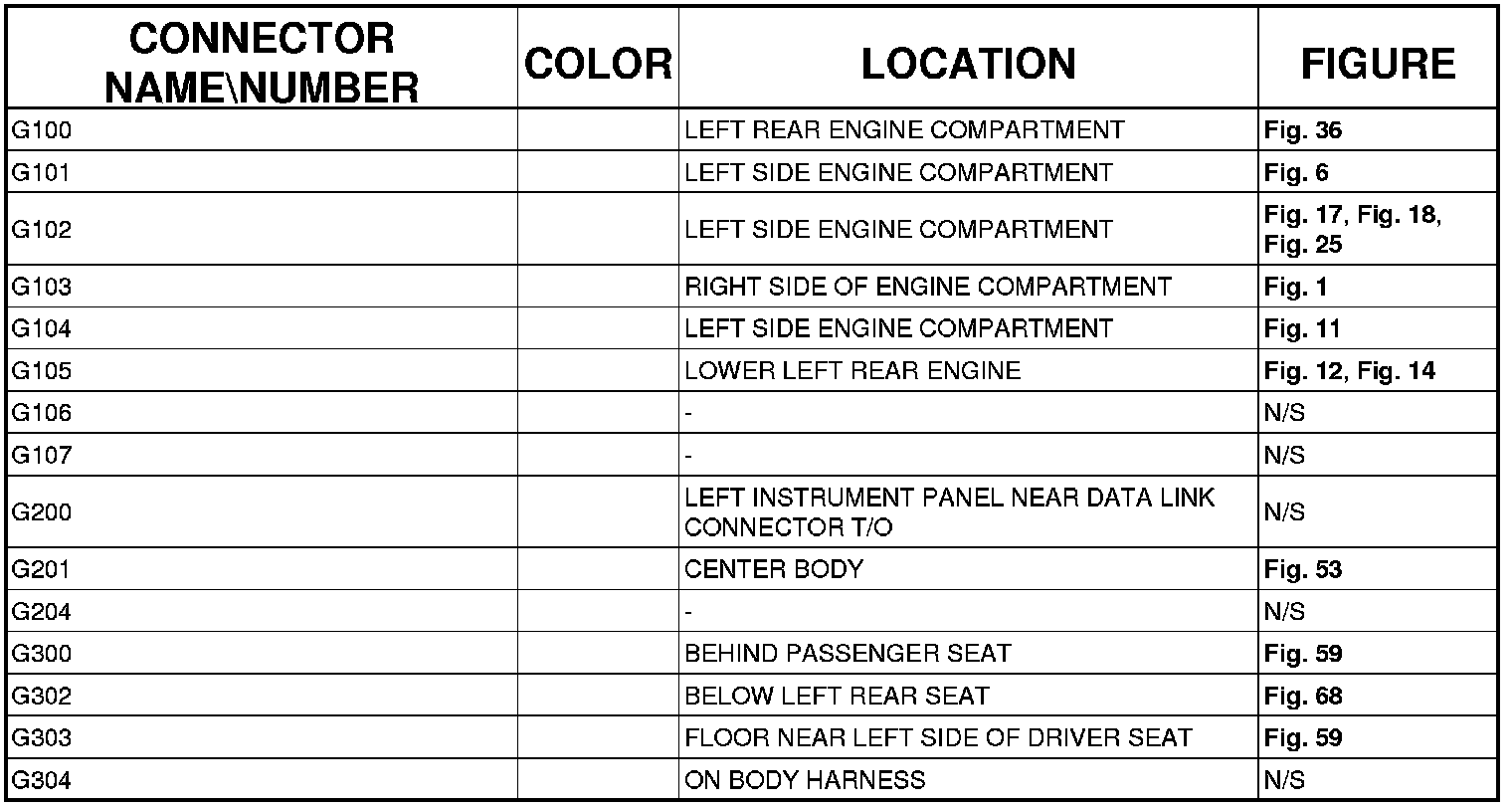 The abbreviation T/O (Take Out) is used in the location column to indicate a point in which the wiring harness branches out to a component.