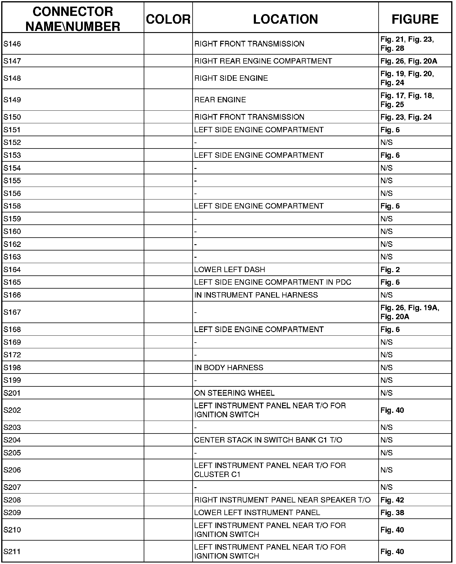 The abbreviation N/S means Not Shown in the illustrations.