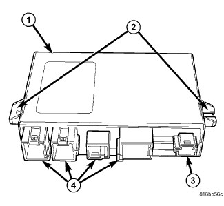 There are two mounting tabs (2) integral to the TM housing are secured by two nuts to two studs integral to the mounting plate. Four connector receptacles (4) containing terminal pins that connect the module to the vehicle electrical system are integral to the one side of the housing. One additional receptacle (3) is not utilized in this application.
