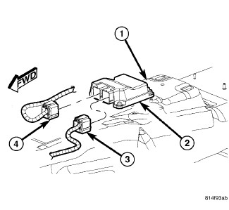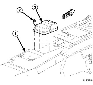 1. Carefully position the Occupant Restraint Controller (ORC) (3) onto the ORC mount on the floor panel transmission tunnel (1). The bottom of the ORC housing is keyed. When the ORC is correctly positioned, the bottom of the housing will fit flush with the mount and the orientation arrow on the label on top of the housing will be pointed forward in the vehicle.