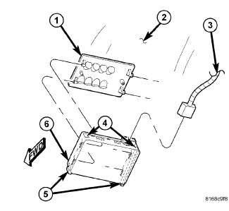 1. Be certain that the two sliding cam locks (5) extend downward (installation position) from the lower side (the side opposite the connector) of the Rain Sensor Module (RSM) housing (6).