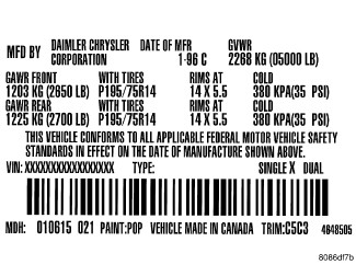 A vehicle certification label is attached to every Chrysler Corporation vehicle. The label certifies that the vehicle conforms to all applicable Federal Motor Vehicle Standards. The label also lists: