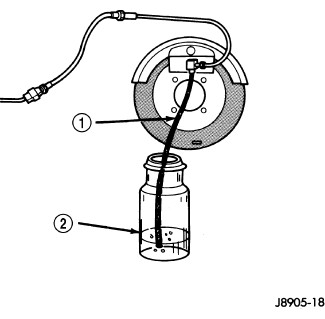 3. Attach one end of bleed hose (1) to bleed screw and insert opposite end in glass container (2) partially filled with brake fluid. Be sure end of bleed hose is immersed in fluid.