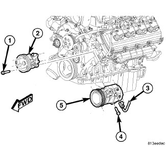 NOTE: The A/C compressor may be removed and repositioned without disconnecting the refrigerant lines or discharging the refrigerant system. Discharging is not necessary if servicing the A/C clutch, clutch coil, engine, engine cylinder head or the generator.