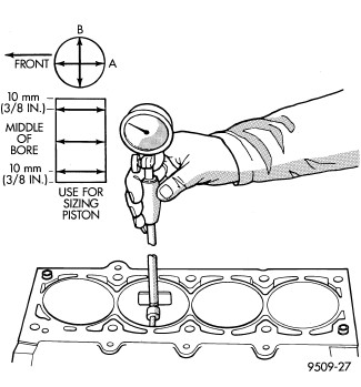 Measure the cylinder bore at three levels in directions A and B. Top measurement should be 10 mm (3/8 in.) down and bottom measurement should be 10 mm (3/8 in.) up from bottom of bore. Engine Specifications.