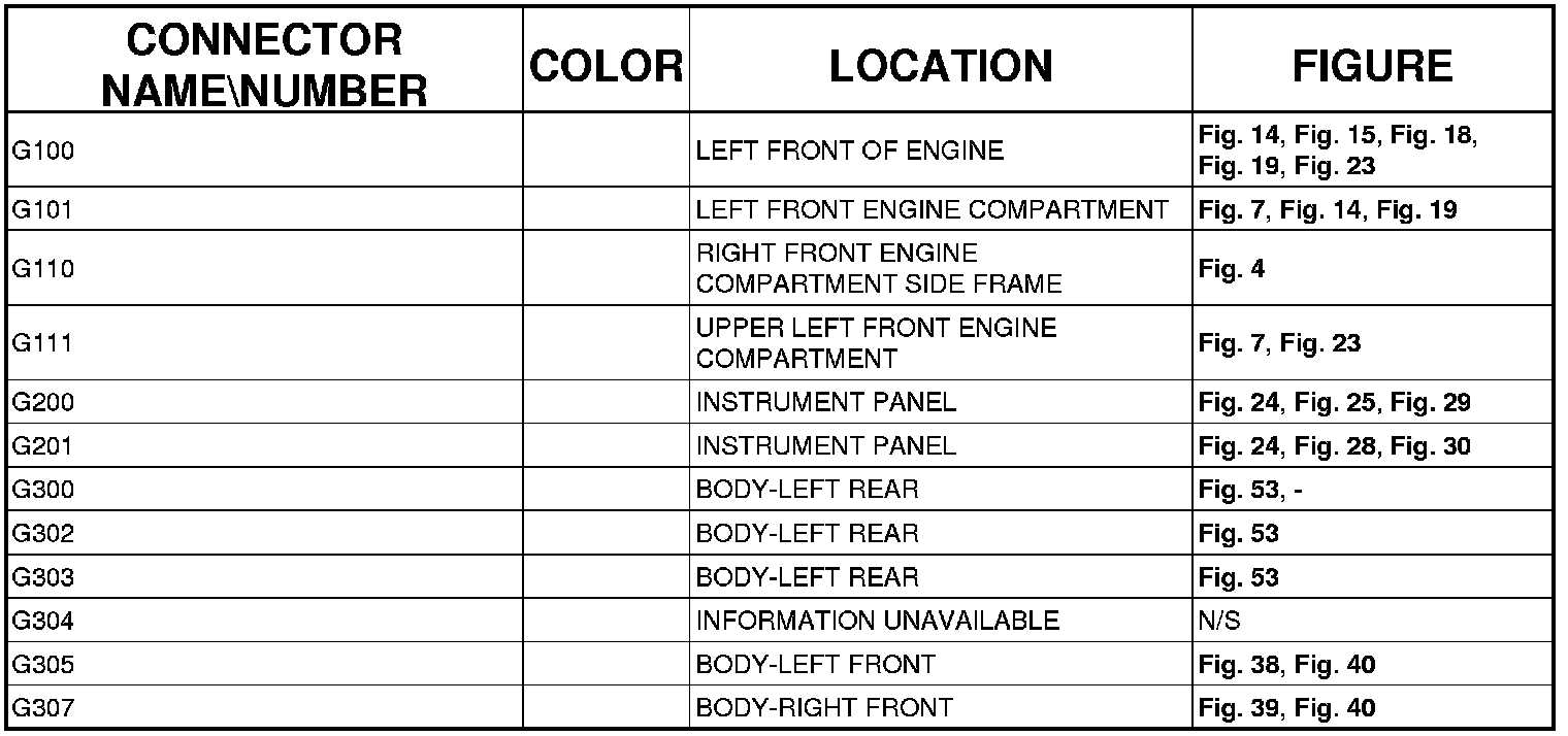 The abbreviation T/O (Take Out) is used in the location column to indicate a point in which the wiring harness branches out to a component.