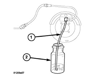 1. Attach a clear plastic hose (1) to the bleeder screw and feed the hose into a clear jar (2) containing enough fresh brake fluid to submerge the end of the hose.