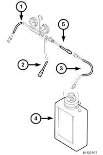 2. Connect special tool Drain Extension Hose 535680 (3) to the Fuel Pressure Gauge Assembly Drain Hose (5).