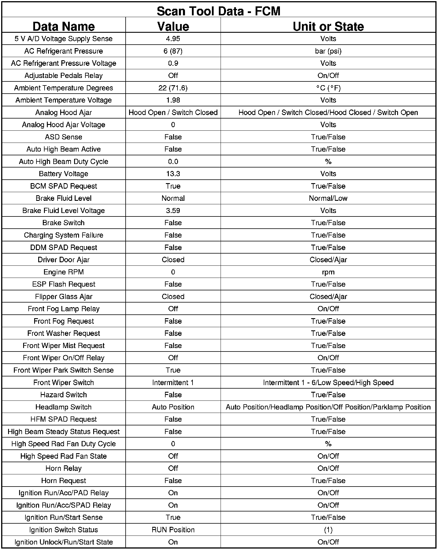 The following chart lists data values taken from the Scan Tool Front Control Module (FCM) data list. The data is to be used for reference only.
