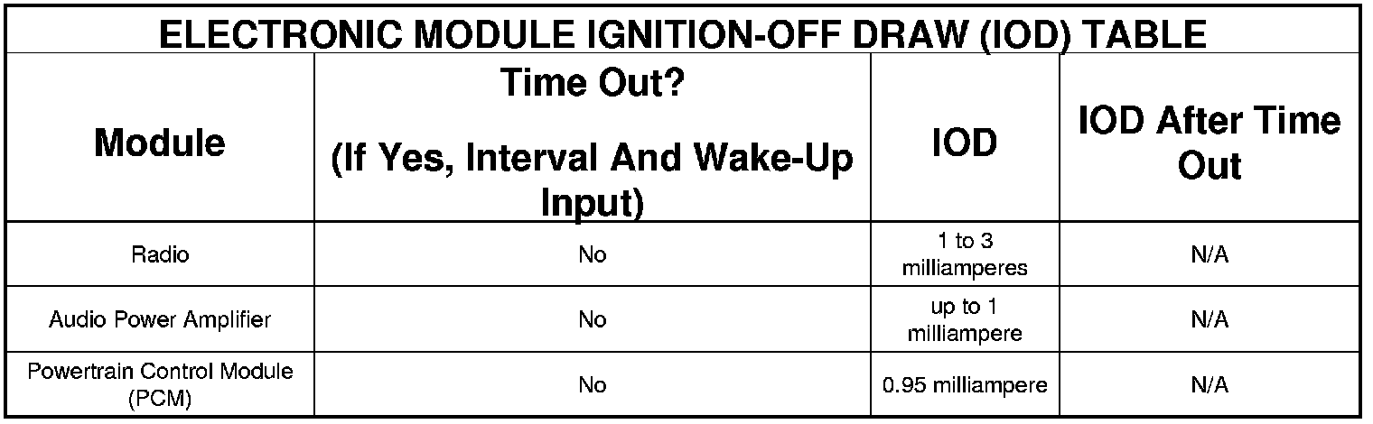 The term Ignition-Off Draw (IOD) identifies a normal condition where power is being drained from the battery with the ignition switch in the Off position. A normal vehicle electrical system will draw from five to thirty-five milliamperes (0.005 to 0.035 ampere) with the ignition switch in the Off position, and all non-ignition controlled circuits in proper working order. Up to thirty-five milliamperes are needed to enable the memory functions for the Powertrain Control Module (PCM), digital clock, electronically tuned radio, and other modules which may vary with the vehicle equipment.