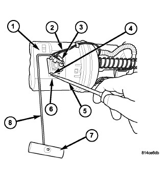 3. To remove sending unit from pump module, use a small pick (5) or screwdriver. Lift on plastic locking tab (4) while sliding sending unit (3) down the mounting tracks (6).