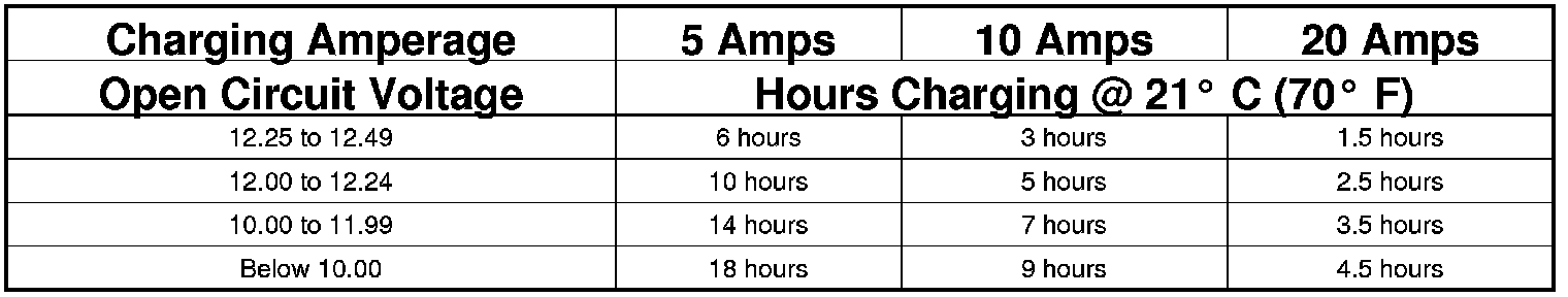 The Conventional Battery Charging Time Table gives an indication of the time required to charge a typical battery at room temperature based upon the battery state-of-charge and the charger capacity.