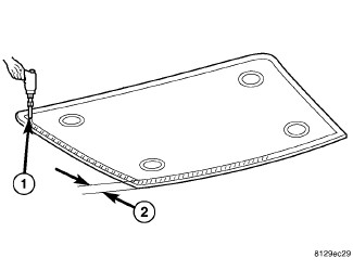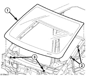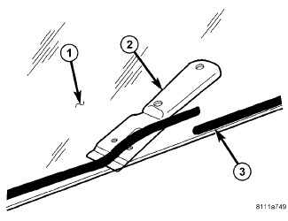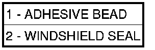 1. Apply bead of adhesive (1) with a triangular nozzle directly to the windshield seal starting at bottom in center of windshield.